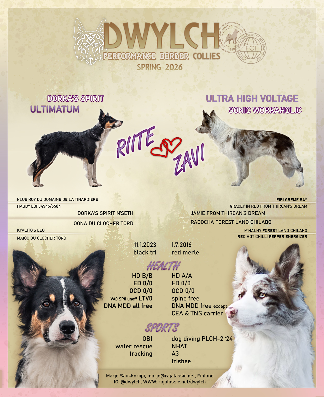 I aim to breed dogs that are healthy both physically and mentally. In my breeding work, I try to avoid the most common lines, well-known OCD/epilepsy pedigrees, as well as inbreeding. I want to contribute to the development of the breed and am willing to make the effort to seek out less common lines.